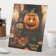 Tafelschild aus Halloween-Party mit Hexenkürbissen mit Kerzen und Blume. Schön, den Gästen Ihres Party Süßigkeiten oder andere Leckereien anzubieten.
