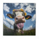 Ein spielerisches, nahes Bild einer Kuh, stehend auf einer sonnigen Wiese, geschmückt mit einer blühenden Krone aus Molkereien und Wildblumen. Die Kuh hält sich die Zunge heraus und verleiht der Szene eine Touch Spaß und Charme. Der hellblaue Himmel und weiche Wolken im Hintergrund verstärken das fröhliche und skurrile Erscheinungsbild des Bildes.