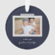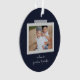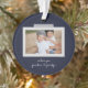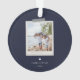 Fröhliche Gefühle Schnappschuss-Ornament. Features, 2 gerahmte Fotos mit Scrapbook-Stil-Waschbänder Akzente, 3 Template-Textzeilen für Ihre Nachricht, Namen und Jahr mit Herzdetails in Weiß auf marineblauen Hintergrund.