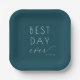 Diese Hochzeitstafel zeigt ein modernes und anspruchsvolles Design mit einem tiefen Teal-Hintergrund, der einen auffallenden Kontrast zum weißen Text bildet. Das Layout ist minimalistisch und zeigt den Ausdruck "BEST DAY ever" in einer Kombination aus sauberen sans-serif- und eleganten Script-Schriftarten, wodurch eine festliche und optimistische Stimmung entsteht. Perfekt für die Erinnerung an unvergessliche Anlässe, vereint dieser Teller Kühnheit mit Eleganz und ist somit eine ideale Wahl für Hochzeiten oder besondere Ereignisse.
