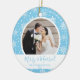 Dieses Ornament mit einem schönen Schneeflocken-Design auf blauem Hintergrund ist das perfekte Geschenk für das frisch verheiratete Paar in Ihrem Leben. Der Text lautet "Merry and Verheiratet" und hat Platz für den Namen des Paares, das Jahr und ein Hochzeitsfest Foto.