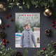 Traditionelle Urlaubsfotokarte mit einem vertikalen Bild mit individuellem "Fröhlicher Weihnachtstext" mit Bildlauf, den Sie mit Ihrem Familiennamen und dem Jahr personalisieren können. Ein Muster weißer Schneeflocken zieht sich auf der Kartenrückseite an. Klassische Rot-, Grün- und Graufarben können individuell angepasst werden. Fotografie © Storytree Studios, Stanford, CA