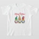 Ein T - Shirt für Mädchen mit einer Kalligraphie im Urlaubsstil, die "Frohe Weihnachten" und Ihr individuelles Jahr oder Datum liest. Dieses lustige skurrile Design verfügt über eine Gruppe von drei bunten Aquarellgarten-Zwerge, die für die Ferien gekleidet sind.
