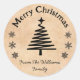 Dies ist eine Beschreibung eines Weihnachtsaufklebers. Der Aufkleber enthält die Worte "Frohe Weihnachten" in schwarzem Schriftart, Set vor einem kraftfarbenen Hintergrund. In der Mitte des Aufklebers befindet sich ein Bild eines Weihnachtsbaumes, der mit Schneeflocken geschmückt ist. Der Aufkleber hat eine klassische runde Form.