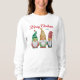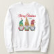 Ein Frauenpullover mit Kalligraphie im Urlaubsstil mit dem Titel "Frohe Weihnachten" und Ihrem persönlichen Jahr oder Datum. Dieses lustige skurrile Design verfügt über eine Gruppe von drei bunten Aquarellgarten-Zwerge, die für die Ferien gekleidet sind.