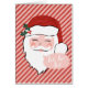 Diese Karte zeigt ein fröhliches Santa-Gesicht auf einem rosa und rot gestreiften Hintergrund mit Text, der "ho, ho, ho" in weißen Buchstaben in einer rosa sprechenden Blase sagt. Das Innere hat einen Feriengrüßen und einen Ort, an dem Sie sich mit Ihren Namen ganz individuell gestalten können.