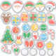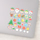 Fröhliche mehrfarbige Weihnachtsaufkleber mit Santa, Rentiere, Elfen, Schneemann, Eisbär, Geschenke, rote und grüne Bögen, Dekorationen, Bonbons, rote Socken, etc.