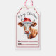 Ein spielerisches Design von Weihnachtsmarken zeigt eine Kuh, die eine Weihnachtsmannmütze trägt, die sich perfekt eignet, um Urlaubsgeschenke mit einer Touch Launen zu versehen. Das farbenfrohe Etikett lädt zu feierlichem Beifall und Kreativität ein.