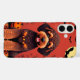 Eine Cartoon-Darstellung eines fröhlichen braunen Hundes, der unter Halloween-Dekorationen sitzt. Der Hintergrund ist eine Orange mit einem großen gelben Mond und mehreren fliegenden Fledermäusen.