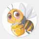 Eine fröhliche Cartoon-Biene hält ein Glas Honig und lächelt hell.