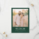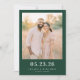 Diese Hochzeitseinladung zur Vorankündigung hat ein rechteckiges Layout mit einem zentralen Foto, das von einem soliden dunkelgrünen Rahmen umrandet wird und zwei Personen in einer Außenkulisse während des Sonnenuntergangs oder -aufgangs zeigt. Die Farbpalette umfasst erdige Töne wie sanftes Beige, gedämpfte Grüntöne und warmes Gold, die ein rustikales Eleganz-Thema schaffen. Das Design verwendet eine fette, serifenlose Typografie für anpassbare Platzhalter, was den modernen Reiz verstärkt. Die Stimmung ist fröhlich und feierlich, perfekt, um Ihren besonderen Tag mit einer Note natürlicher Schönheit anzukündigen.