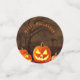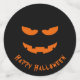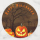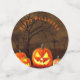 Halloween-Szene mit leuchtenden Kürbissen in einem gruseligen Friedhof mit leuchtendem Mond. Die Worte "Happy Halloween" auf der Vorder- und Rückseite können durch das Menü "Personalisieren" auf das geändert werden, was Sie sich wünschen. Hier können Sie den Stil, die Farbe und die Größe des Schriftartes ändern. Teil der Kollektion "Creepy Halloween Graveyard Party Accessories".