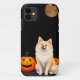 Ein fröhlicher Hund im Cartoon mit flauschigen Fellen, sitzend fröhlich vor zwei Jack-o'-Laternen. Der Hund hat einen hellen Mantel mit weißer Mane und trägt einen fröhlichen Ausdruck. Hinter dem Hund befindet sich ein dunkler Hintergrund, der von einem Holzbogen gerahmt ist, der mit Ästen geschmückt ist