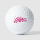Ein naher, weißer Golfball, der auf einem Tee ruht, Set vor einem grünen Grashintergrund. Der Ball enthält einen fröhlichen rosa Text, der lautet: "Muttertag des Glücks, mit kleinen Herzen geschmückt,