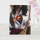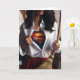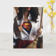 Glücklicher Muttertag mit einer Frau, die einen Besen und ein unverknöpftes Shirt mit einem Superhelden-Kostüm hält. Mamas sind Superhelden!