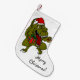 Ein Spaß-Cartoon Trex Dinosaurier kleidete in einer Weihnachtsmannmütze mit Geschenken an