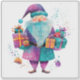 Ein fröhlicher, skurriler Weihnachtsmann, der in lebhaften violetten Tönen geschmückt ist, trägt eine Reihe farbenfroher Geschenke, die den Geist von Weihnachten verkörpern.