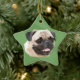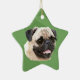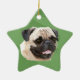Dieses niedliche Mopsporträt ist auf einer Verzierung mit einem Weihnachtsgrünhintergrund. Sie können Text oder Bilder der Rückseite auch hinzufügen.