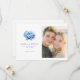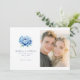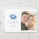Diese Hochzeitseinladung zum Speichern des Termins verfügt über ein geteiltes Layout mit einer großen, eleganten blauen Pfingstrose auf der einen Seite und einem Fotobereich für ein Paar auf der anderen Seite. Das Design verwendet eine weiche Farbpalette aus Blau- und Grüntönen, die eine romantische und ruhige Atmosphäre schafft. Der Text ist in einer klassischen Serifenschriftart angeordnet, was die zeitlose Eleganz der Einladung unterstreicht. Perfekt für Paare, die einen freudigen und anspruchsvollen Ton für ihre bevorstehende Hochzeit setzen möchten.