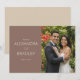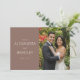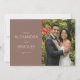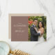 Diese Hochzeits-Dankeskarten haben ein geteiltes Design mit einem soliden braunen Hintergrund auf der linken Seite, elegant ergänzt durch eine off-white Serif-Typografie, die einen Hauch von klassischem Charme verleiht. Die rechte Seite zeigt ein freudiges Foto von zwei formell gekleideten Personen, umgeben von üppigem Grün und lebendigen roten Blumen, was eine warme und festliche Atmosphäre schafft. Der nahtlose Übergang zwischen dem strukturierten Text und dem persönlichen Foto balanciert Förmlichkeit mit herzlicher Wärme aus und macht diese Karten perfekt, um nach Ihrem besonderen Tag Dankbarkeit auszudrücken.