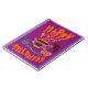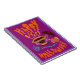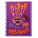 Original Illustration einer Katzenliebhaberwitsche Tasse Kaffee mit giftiger Tasse, Hexe, Kürbis, Zauberstab und kleinen Dampfgeistern mit handgeschriebenem Sprichwort Happy Halloween. In orangefarbenem und lila, maximalistischem Stil und Farben.