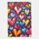 Eine lebhafte und farbenfrohe Herzenreihe füllt die Szene, die in Größe und Schatten variiert, vor einem dunklen Hintergrund. Die Herzen sind in Rot, Blues, Gelb und Rosa gehalten und sorgen für eine lebendige und fröhliche Atmosphäre.