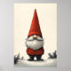 Eine bezaubernde Abbildung eines festlichen Gnoms, gekleidet in einem lebendigen, roten Hut und Mantel, stehend in einer ruhigen, verschneiten Landschaft. Der lange, weiße Bart und der skurrile Nase flüchtige Blick aus der Höhe, spitzer Hut, der ein Gefühl von Urlaubsfreudigkeit und nordischer Folklore hervorruft.