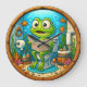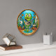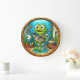Diese Rundwand ist mit einem hübschen Cartoon eines grünen Frosches versehen, der auf einer Toilette sitzt und in Zeitungen eingeschlossen ist. Das Unterwasserbadezimmer ist mit einem kleinen orangefarbenen Fisch, Seestern und verschiedenen Badezimmerzubehör wie einer Papierrolle, Handtüchern und Fässeln ausgestattet. Die Uhr hat einen natürlichen Rahmen aus Holz und klare schwarze Zahlen.