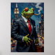 Das Bild zeigt ein Gemälde eines grünen Frosches, der in einem dunklen Anzug mit einer roten Krawatte gekleidet ist und eine Zigarre im Mund hält. Der Frosch hat große, orangefarbene Augen und hält eine Aktentasche. Im Hintergrund ist nachts ein Stadtbild mit dem Empire State Gebäude zu sehen. Der Malstil erinnert an das Öl auf der Leinwand, mit sichtbaren Pinselstrichen und einem leicht verschwommenen Effekt.