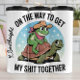 Diese humorvolle Abbildung zeigt einen Frosch in einem Cowboyhut und Bandana, der auf dem Rücken einer lächelnden Schildkröte reitet. Die Kunst hat einen einfachen, handgezeichnet Stil mit Sternen im Hintergrund. Der Text lautet: "AUF DEM WEG, MEIN S ZU BEGINNEN, ICH BIN ZUSAMMEN", was dem Design ein sehr relatives und lustiges Gefühl gibt.