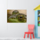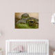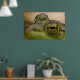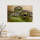 Dieses Poster zeigt ein nahes, grünes Froschauge, während sie an einem heißen Sommertag im Teich schwimmt. Ihre Iris ist ein unglaubliches Muster aus Gold und Gelb. Der pur schwarz-ovale Schüler in der Mitte reflektiert Bäume in der Ferne.