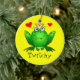 Niedliche Froschprinzessin und Prinz mit roten Herzen, fröhliches Gelb-Ornament, das Ihnen viel Liebe und Happy bringt! Die Froschnamen sind Beulah und Twitchy, aber Sie können dieses Ornament mit Ihren eigenen Namen oder kurzen Text personalisieren. Dieses zauberhafte Märchenkönigpaar trägt goldene Kronen mit roten Edelsteinen. Der hübsche Frog Prince hat googy blaue Augen und ein wunderschönes Lächeln; die schöne Prinzessin hat schwefelblaue Augen, einen Schönheitsort, lange Wimpern und ein etwas sassenes Lächeln! Großartiges Geschenk für Paare.