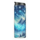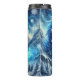 Ein mächtiger, eisblauer und weißer Drache mit feinen, wirbelnden Mustern liegt auf einer schneebedeckten, gebirgigen Landschaft. Der Drache strahlt eine wirbelnde Blase aus eisiger Energie und Schnee aus, während Schneeflocken vom dunklen, bewölkten Himmel fallen, der von einem fernen Licht erhellt wird.