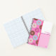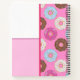 The artist's pattern design of frosted doughnuts is on the side of the notebook, front and back. On the other is a white and pink square with a pink line in the middle. And the texts can be personalized by the customer.