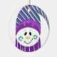 Ein niedlicher Schneemann in einer gestreiften lila, weißen und grünen Spielecke und einem grünen Schal. Süße Wangen und eine Orangennase.