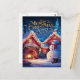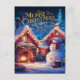 Festliche Weihnachtskarte mit einem fröhlichen Schneemann, der vor einem gemütlichen Haus in einer schneebedeckten Landschaft stehend ist.