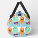 Ein niedliches und unterhaltsames Muster von köstlichen frostigen Eiscremesuchucheln und orangefarbenen Popsikeln auf der konus cool frostigen, frostigen Dessert Leckerei Happy Logo Ikone Cartoon Spaß fröhlich fröhliche ästhetische Spaß Design Slogan illustrierte Deluxe tragen alle duffel Tasche. Holen Sie sich heute einen niedlichen Milchshake aus Eis, der zum Thema Deluxe-Duffle gehört.