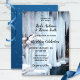 Eine Wintereinladung mit einem gefrorenen Wasserfall mit Kerzen und glitzernden Schneeflocken.