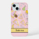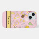 Dieses iPhone-Gehäuse mit farbenfrohen abstrakten Früchten und Memphis-Mustern auf Rosa und Gelb personalisieren. Editieren Sie einfach den Namenstext. Wählen Sie aus zwei Stilen für Apple iPhone 15 oder einer Vielzahl anderer Telefonmodelle im Drop-Down-Menü.