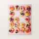 In diesem hübschen Puzzle mit kleinen Donuts oder Dudelsacken, die mit Obst und Zuckerguss bedeckt sind, macht sich der Vergnügen für den Feinschmecker. Rosa, Orange, lila, Rot, Weiß, Blau, Orange und grüne Touchs. Würde ein schönes gerahmtes Stück machen, wenn du fertig bist.