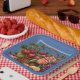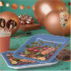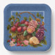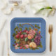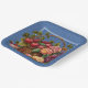 Ein blauer, ewiger Hintergrund mit Obstkorb und Papiertüten aus Floralholz