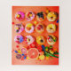 Mit diesem bunten Puzzle mit Früchten UND Donuts macht es allen Feinschmeckern Spaß. Sehr farbenfroh und produziert ein hübsches fertiges Bild, das Sie für Ihre Küche, wenn Sie möchten, rahmen können. In vielen Farbtönen Orange, Rosa, Gelb, Blau, Rot und einer Touch Blau und Grün. Früchte wie Beeren, Grapefruit, Orangen, Heidelbeeren, Himbeeren, Donuts und Bagels mit Zuckerguss und Sprinklen.