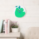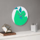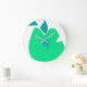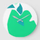 Diese weiße Hintergrundwanduhr hat eine Illustration in Form einer grünen Birne und dreieckig blauen Mitte.