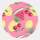 Fruchtsäfte auf rosafarbenem Hintergrund. Runder Aufkleber