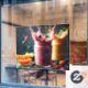 Das Bild zeigt zwei Gläser von lebhaften Fruchtsäften mit dunkelblauem Hintergrund. Ein Glas enthält einen rosa oder roten Smoothie, das andere einen gelben Smoothie. Die Gläser schaffen einen Glanz und bilden einen visuellen Effekt, der an eine Krone erinnert. Verschiedene Früchte, Heidelbeeren, Orangen, Erdbeeren, Kiwis, Himbeeren und Minze-Blätter verteilen sich auf das Thema. Einige dieser Früchte fallen in die Gläser und tragen so zum Splash-Effekt bei. Das gesamte Ambiente strahlt eine erfrischende und lebendige Atmosphäre aus.