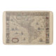 Dieses Design zeigt eine Landkarte von Amerika (einschließlich der Regionen, die von den modernen Ländern der USA, Kanadas, Mexikos, Brasiliens und anderer lateinamerikanischer und karibischer Staaten besetzt sind), die von dem 1617 erschienenen niederländischen Karikaturisten Willem Blaeu (1571-1638) erstellt wurde. Der lateinische Titel der Karte ist "Americae Nova Tabula", was "New Map of American Land" bedeutet. Blaeus Landkarte repräsentiert den unvollständigen und unvollkommenen Staat der geographischen Kenntnisse zum Zeitpunkt ihrer Herstellung, ist jedoch in vielerlei Hinsicht überraschend präzise: So zeigt sie beispielsweise Tierra del Fuego an der Spitze Südamerikas als Insel korrekt an. (Eine niederländische Expedition unter Willem Cornelisz Schouten und Jacob le Maire hatten gerade in den Jahren 1615-1616 die Welt umkreist und eine neue Passage entdeckt - die Straße von Le Maire, die auf der Karte als "Fretum le Maire" dargestellt ist - südlich von Magellans Straße, die beweist, dass Tierra del Fuego tatsächlich eine Insel ist.)