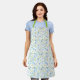 Schürze mit hellen, fröhlichen Frühlingsmustern in Blau- und Grüntönen. Die Blume ist in der Mitte des 20.