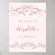Das niedliche Begrüßungsschild (Plakat) aus dem 1. Lebensjahr ist mit einem rosa Blütenrand mit Bögen und Schmetterlingen geschmückt.
