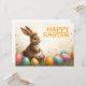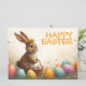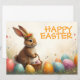 Ein niedliches Osterhasen mit einer Blume liegt liebevoll inmitten farbenfroher Ostereier. Er hält einen kleinen Korb mit bemalten Eiern in seinen Pfoten. Die Szene ist von zarten Frühlingsblumen und warmen Licht umgeben. Die Inschrift "Happy Oaster" glänzt in fröhlicher Orange über dem Hasen - ein herzlicher Gruß, der die Leichtigkeit und Freude des Frühlingsfestivals einfängt.