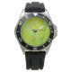 Diese Uhr zeigt ein abstraktes Originalfoto von ZoeSPEAK von Regentropfen auf einem Blatt. Im näheren Foto sehen wir die Beschaffenheit und die Adern des Blattes in den Konturen der Wassertropfen vergrößert. Das leuchtend gelbe grüne Blatt reflektiert das Blau und Gelb des Himmels und des Sonnenlichts.